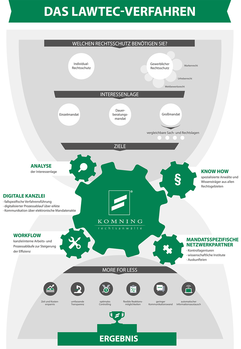 Mit unserem eigens entwickelten Verfahren der Mandatsbearbeitung fassen wir den Begriff der juristischen Dienstleistung weiter und bringen die zunehmende Nachfrage nach effizienten Verfahrensmodellen und vereinfachten Bearbeitungsprozessen mit einem am Anwaltsmarkt nur selten anzutreffenden Angebot zusammen. Mit LAWTEC gelingt es uns, dass Know-how, die Expertise und die Erfahrung vieler Anwälte in einer flexiblen Wertschöpfungskette zur Verfügung zu stellen und unseren Mandanten bereits heute einen innovativen Service zu bieten, der schon bald Dienstleistungsstandard sein wird.Ob Individualrechtsschutz oder gewerblicher Rechtsschutz im Rahmen des Marken-, Urheber- und Wettbewerbsrecht, ob Einzel-, Dauerberatungs- oder Großmandat – das LAWTEC-Verfahren gründet sich auf einem ganzheitlichen Ansatz der Mandantenbetreuung und ermöglicht es der Kanzlei, die individuellen Anforderungen ihrer Mandanten flexibel zu berücksichtigen und diesen stets ein wenig mehr als andere Kanzleien gerecht zu werden. Der besondere Vorteil des Verfahrens liegt in der engen Verzahnung manueller und elektronischer Prozesse, die den internen Arbeits- und Zeitaufwand sowohl für einfache als auch komplexe Fälle effektiv reduziert.